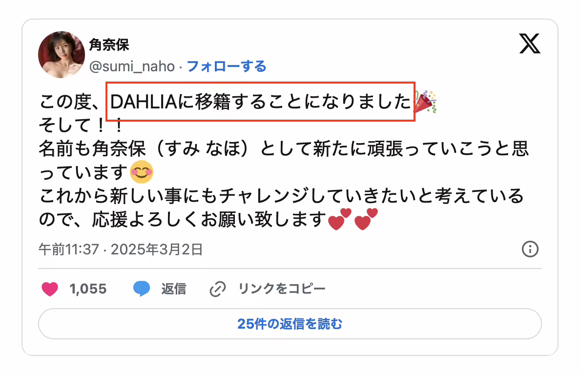 繼續拉下去,謎底揭曉了,原來角奈保是她再一次出道用的藝名,這位女優的真實身份是之前以賽車皇后身分加盟片商S1的「仁藤さや香(仁藤沙耶香)」,改了名字換了片商發片就意味著她從2023年10月開始的S1生涯已經畫下句點,現在要以DAHLIA專屬女優的身分繼續打拼下去~