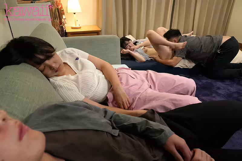 然後話匣子就開了,男優當然是聊一些色色的事情,結果平山羽那也很大方地說自己最想要的就是和朋友一起喝酒,趁著他們睡著的時候偷偷在旁邊打炮ー哇嗚,原來日本的鄉下姑娘都這麼大方這麼敢講,那當然你吩咐我照辦,片商先找了兩個臨時演員充當醉倒的友人,平山羽那竟然就真的和男優搞了起來: