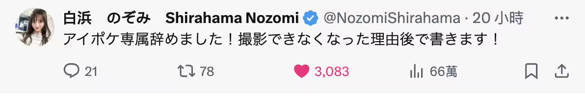 對,意思是她自己不要做了,不是合約到期不續約也不是被片商提前砍頭了,是她辭職不幹了ー為什麼都在業界最頂尖的片商出道了,白浜のぞみ(白濱希)卻不想待下去?她也沒有隱瞞,什麼都說了: