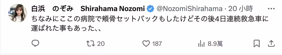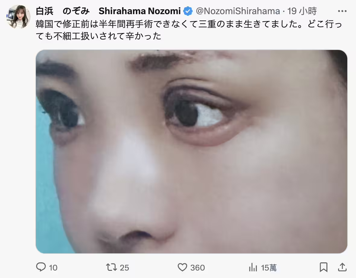 就是「整形失敗」,一年前她在銀座一間超有名的整形醫院進行手術,由於是指名院長動刀還要加付25%的費用,結果手術失敗了ー雖然後來手術費有退還,但從此她就陷入了手術修補然後再度失敗的惡性循環,眼睛的部分最慘,五次手術通通失敗,讓她沒辦法繼續工作,粗估損失在1000萬日幣⋯