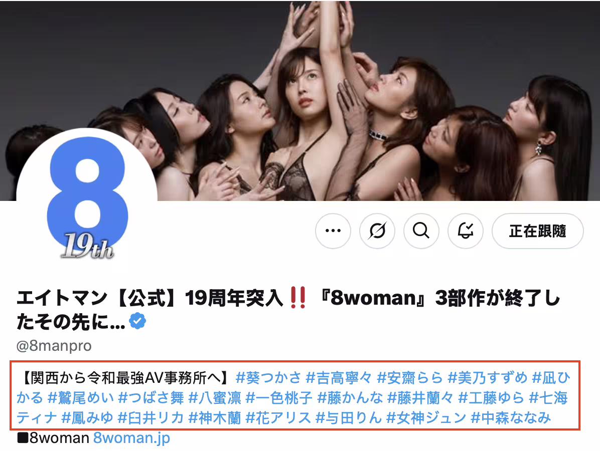 對,我知道官網還在,不過請忘了官網,我認為那只是エイトマン(8MAN)忘了調整,她的狀況我們可以透過另一位女優「朝海汐)來推算:同樣地,在エイトマン(8MAN)官方X的自我介紹欄也已經沒有她的名字,但我知道她並沒有消滅,只是換了經紀公司改了藝名,接下來不會在片商DAHLIA發片,而是會去Will集團(北都,原CA)某片商當專屬女優⋯
