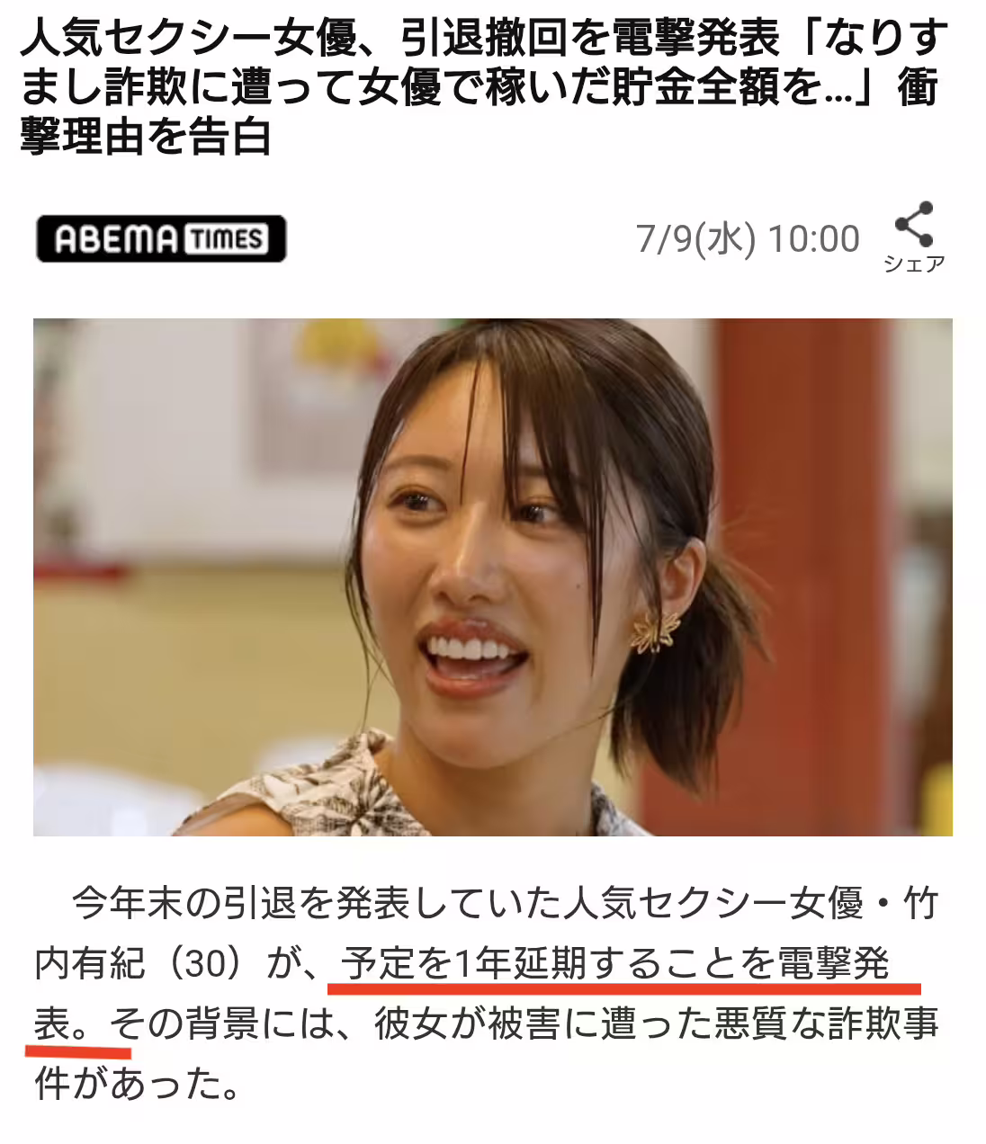 也就是說她的生涯會改成在2026年12月31號畫下句點:我想沒有人會笑她或酸她,因為詐騙實在太可惡了,儘管假檢察官打電話來說你涉入詐騙案必須交出存款以示清白這手法很老套,不過現在的詐騙集團越來越進化,竹内有紀不但被加了line還被知道了本名以及之前居住的地址,再加上在趕行程腦袋沒這麼清楚所以看法院文後心生恐懼所以中招了,不要說在日本了,最近台灣也出現這樣的詐騙方式,當你的名字、地址以及法院的文件一次通通在LINE上面被秀出來時真的很容易被騙⋯