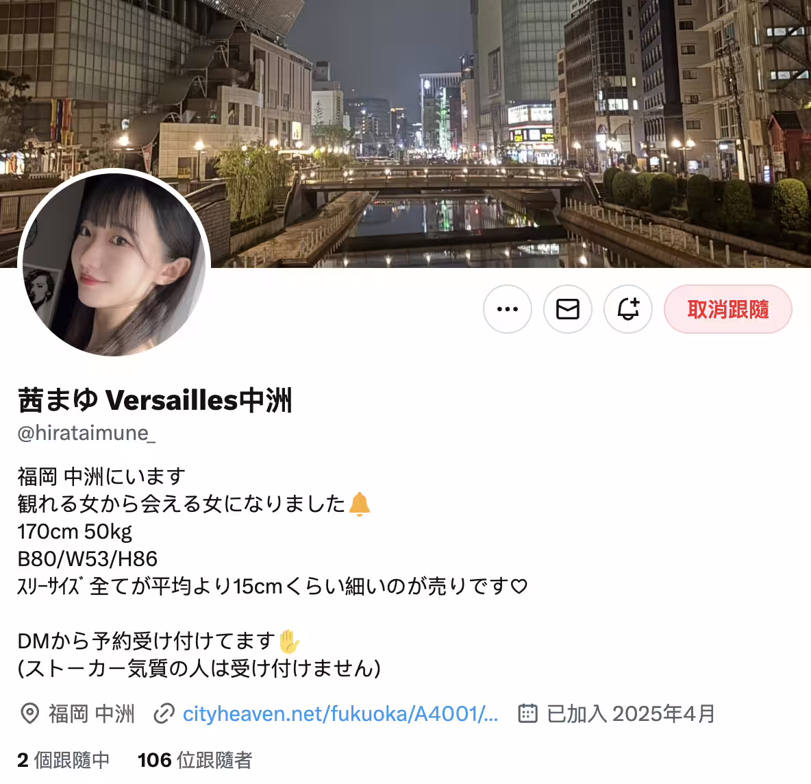 那就是鈴音まゆ(鈴音麻友)現在睡在誰的床上⋯沒有啦,是她的近況,這麼久沒有出片,她還是女優嗎?這一點是有答案的,請大家到她的X(https://x.com/hirataimune_),現在的她已經捨棄了鈴音まゆ(鈴音麻友)的名字改叫「茜まゆ(茜麻友)」,在自我介紹欄說了,AV女優是過去的事了,她不拍了,引退了,原因是家裡有親人過世讓她決定放棄所有的一切;至於現在她在做什麼呢?不再是鈴音まゆ(鈴音麻友)的她請大家去追蹤新的X,然後你就可以在福岡的風俗店約她了: