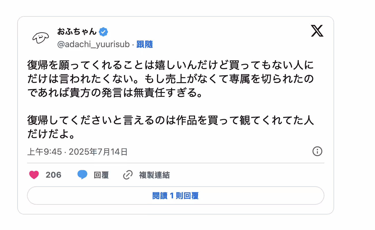 她在X的小帳回道:「雖然聽到大家說想要我回歸很開心,但如果是沒買過作品的人就算了吧,假如我是因為作品銷售不行所以被解約了,那這些沒買作品人的發言就太不負責任了〜」