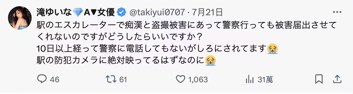 到底是發生了什麼事呢?滝ゆいな(瀧結菜)說自己是在電車站的手扶梯上被鹹豬手騷擾以及偷拍,當下她就非常生氣,只是警方在第一時間竟然不受理她的報案,就這樣拖了十多天⋯