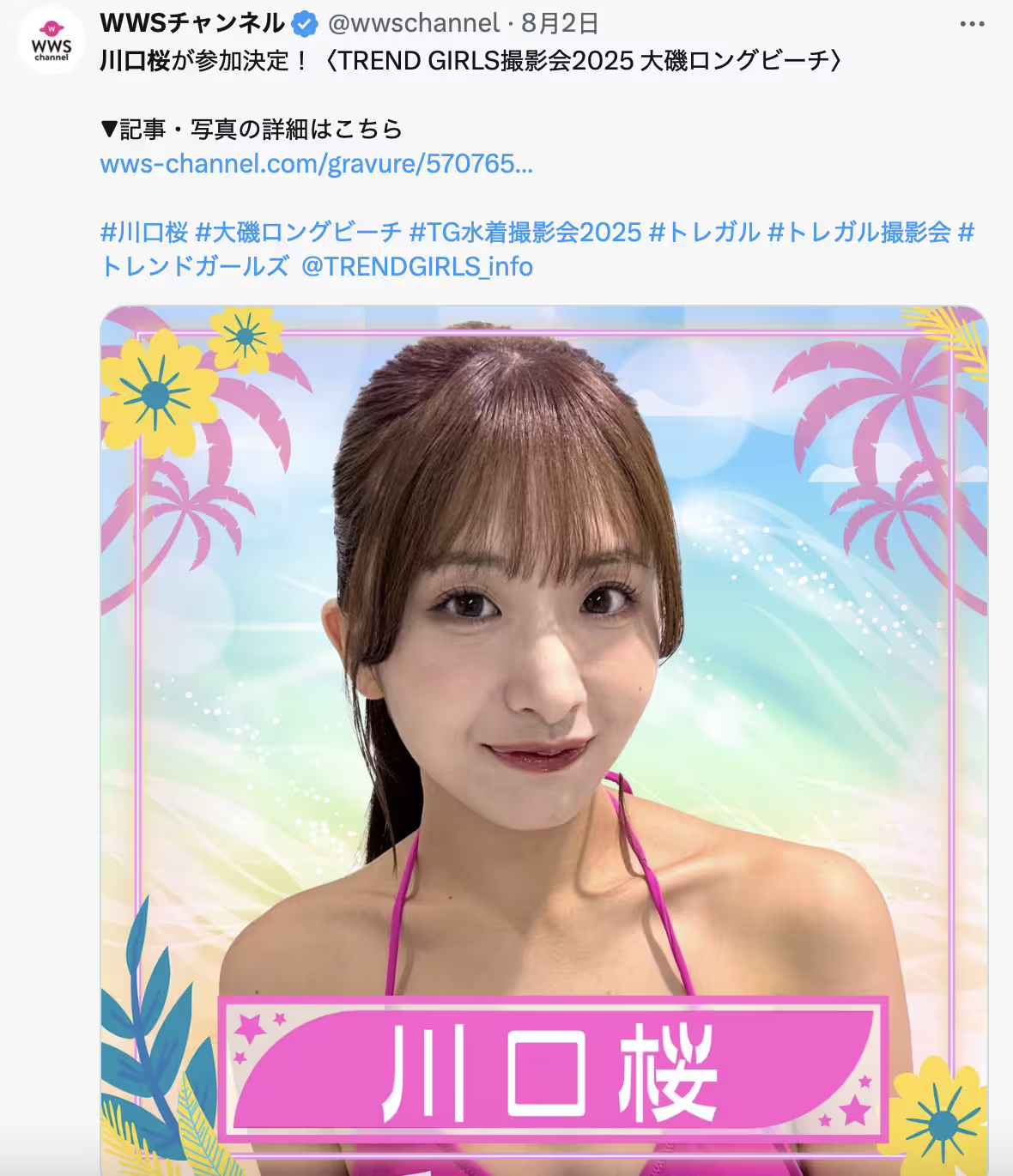 這是Moodyz的專屬新人「川口桜(川口櫻)」,從文案的第一句話就知道她有理想有抱負,想成為每個粉絲心目中的神力女超人ー而她的出現也解答了我們的疑問,因為前兩天廠商Trend Girls要在9月27和28日舉辦的戶外攝影會有介紹她,之前不知道她是何方神聖,現在明白了,她是Moodyz的大型新人: