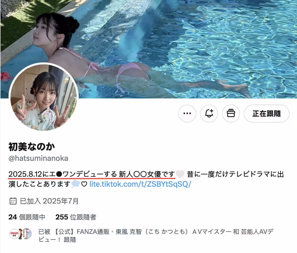 為什麼這麼說?因為這位「初美なのか(初美菜乃花)」在X(https://x.com/hatsuminanoka)的自我介紹欄說了,她是「2025.8.12にエ●ワンデビューする 新人〇〇女優です」,請讓吃了哆啦A夢翻譯蒟蒻的我來解釋一下: