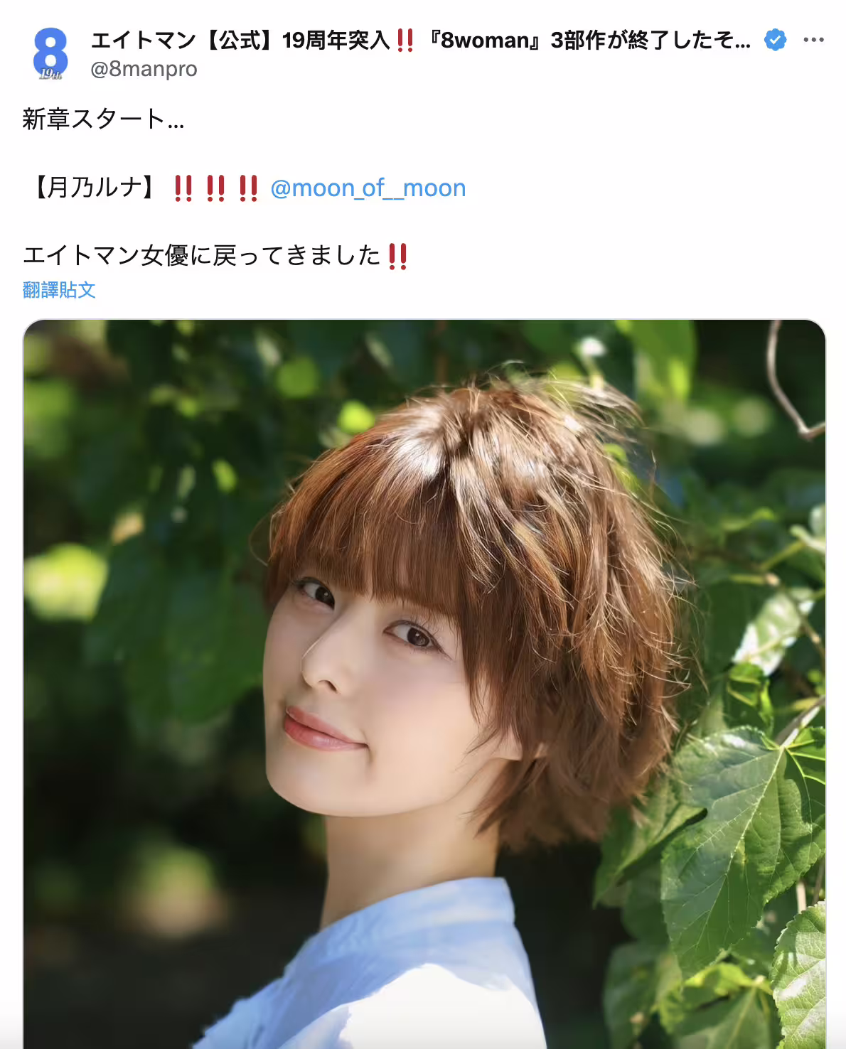 結果她還是月乃ルナ(月乃露娜),因為以為她會換個藝名和過去做切割,但她還是選擇保留這個大家最熟悉的名字;不過エイトマン(MAN)和媒體的關係真的很好,月乃ルナ(月乃露娜)一回歸馬上就有寫真集可以拍,月底就會上市;另外,這家電信公司也把月乃ルナ(月乃露娜)送進網飛(Netflix)、在即興演出的戲劇「デスキスゲーム(接吻生死戰)中軋一角⋯