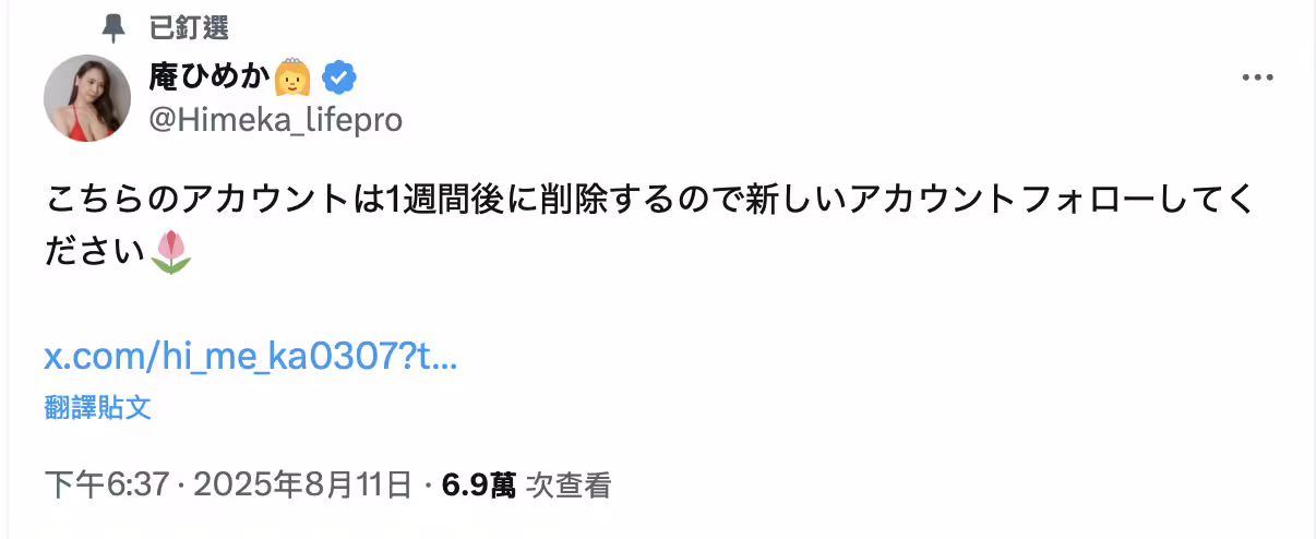至於舊的帳號呢?很抱歉,雖然有超過30萬的追蹤,但庵ひめか(庵姬花)決定一週後要把它刪除了〜