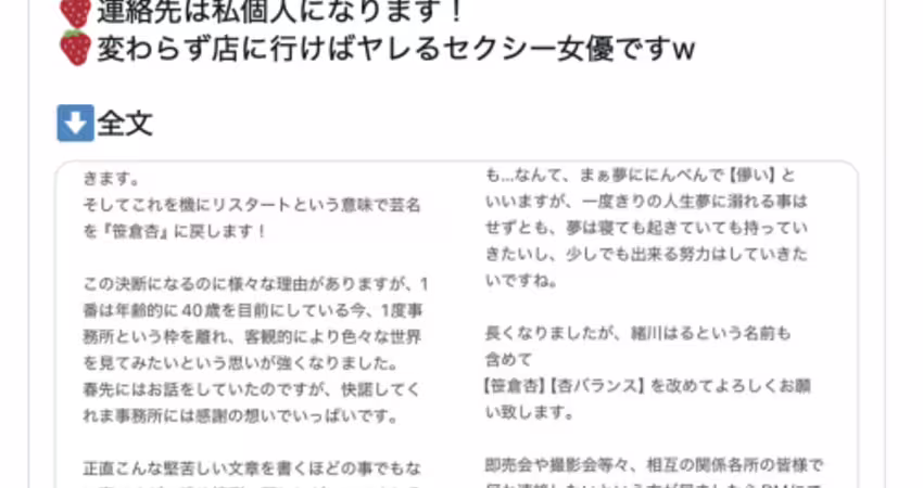 雖然女優更改藝名是家常便飯,但一定有她的理由,緒川はる(緒川杏)是在自己的社群說了,因為想要跳脫事務所的框架,所以她選擇辭職離開了經紀公司,以此為契機,於是把藝名改回了原來的「笹倉杏」: