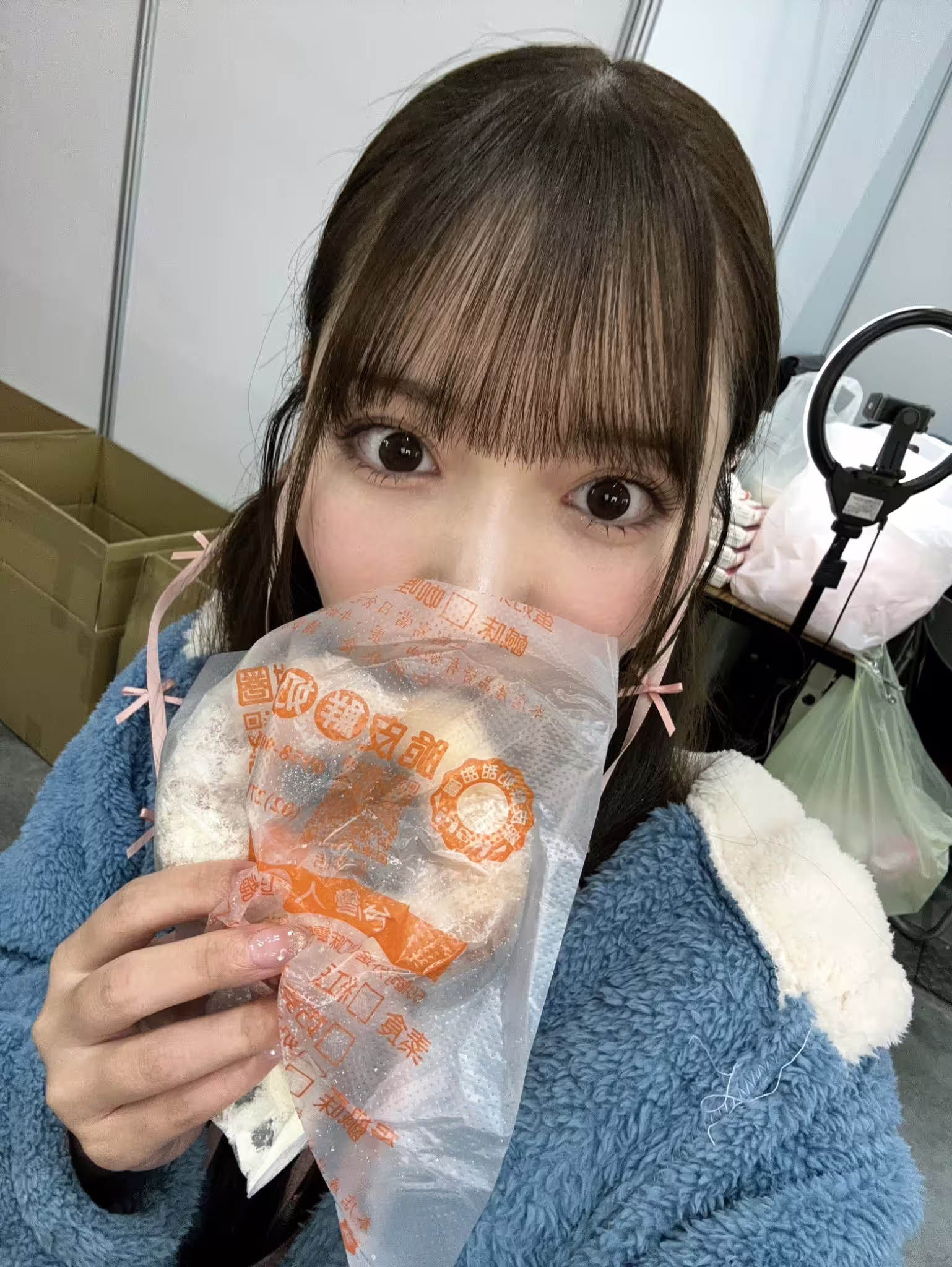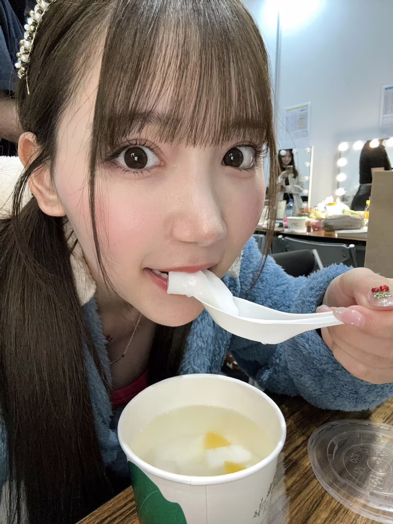 這就是三田真鈴可愛的地方,雖然在合作前事務所再三提醒「她食量非常非常小」、「不要因為她吃很少就以為是招待不周」,不過我們還是找到了突破口ー她很喜歡吃小點心,尤其是甜的,在成人展的時候她喜歡甜甜圈,在台菜的時候愛上了小麻糬,這次攝影會則是水果茶中毒,半糖配椰果,一杯接一杯,她正餐可以不用吃: