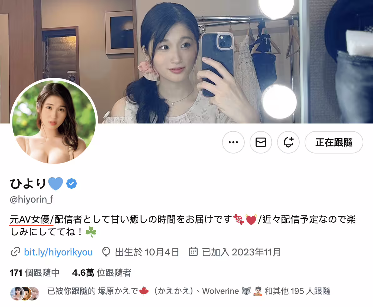 然後她發文了,說自己已經把名字改成了ひより(日和),要以直播主的身分和大家走下去,希望大家多多指教ー然後你看這個帳號,2023年11月在X註冊,目前有4.6萬追蹤,意思是她只改了ID和名字,她是把AV女優時代的帳號直接拿來用了⋯
