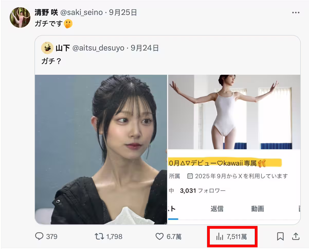 這篇回覆人家「ガチです(是真的)」的留言,一口氣有超過7500萬的觸及,以一個新人而言,這是想都不敢想的流量,肯定會開心得睡不著覺是吧?不過話說回來,明明這兩篇發文沒特別的爆點,清野咲又不是萬眾期待横空出世的超級新人,她甚至沒有在作品情報解禁的第一時間在社群登場,為什麼流量如此巨大?