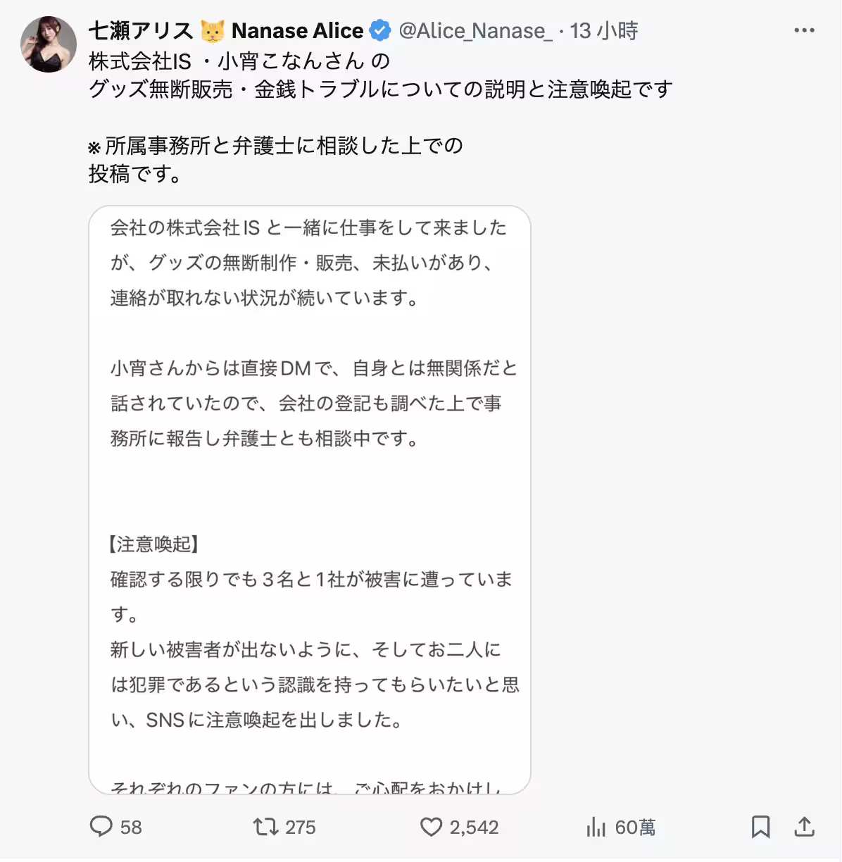 結果七瀬アリス(七瀨愛麗絲)跳出來證實確有此事,小宵こなん(小宵虎南)確實未經授權發行她的週邊商品,事後不但否認參與此事也沒有幫忙追回販售的利潤ー而在認定小宵必須負責的同時她也加碼爆料,有三位女優和一間公司被小宵用同樣的手法騙了ー