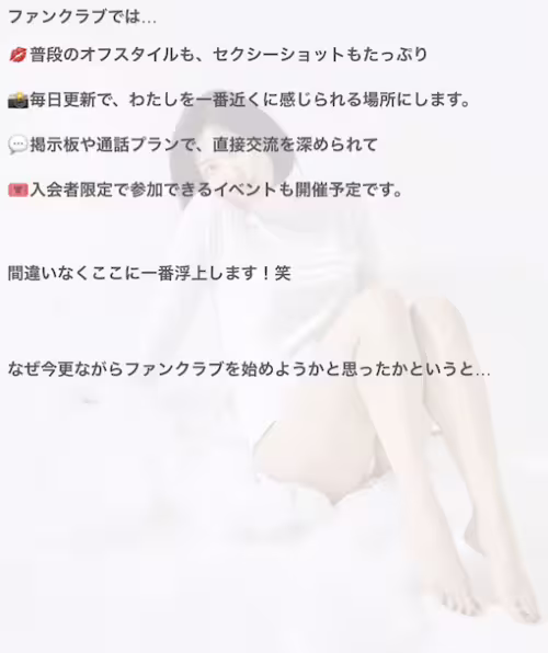 山岸あや花(山岸綺花)說在這個社群的時代,大家只會在意按讚的數字以及照片拍得美不美,讓她沒有辦法隨心所欲地發表自己想要發表的東西,所以她希望有一個能夠把自己真實的心情直接傳達給粉絲的地方,那是屬於她的「家」,也是直接和粉絲交流的園地ー所以山岸あや花(山岸綺花)承諾,每天都會更新粉絲團,會有許多日常的休閒風格照也會有滿滿的性感寫真,透過留言板和通話,她可以和粉絲直接交流,最後最重要的來了,她也會舉辦入會者才能參加的限定活動: