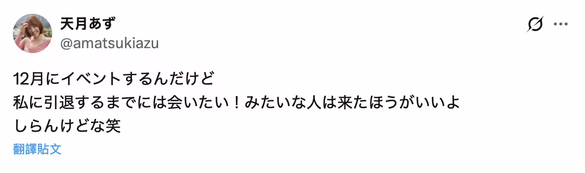 蠻明顯的,天月あず(天月杏)只差沒和大家說「因為要引退了所以你們(粉絲)再不來就見不到我了」,我比較好奇的為什麼不直接公布什麼時候要引退?但她既然這麼說了,那應該就是決定好惹,我認為引退的時間點可能是在2025年12月31日: