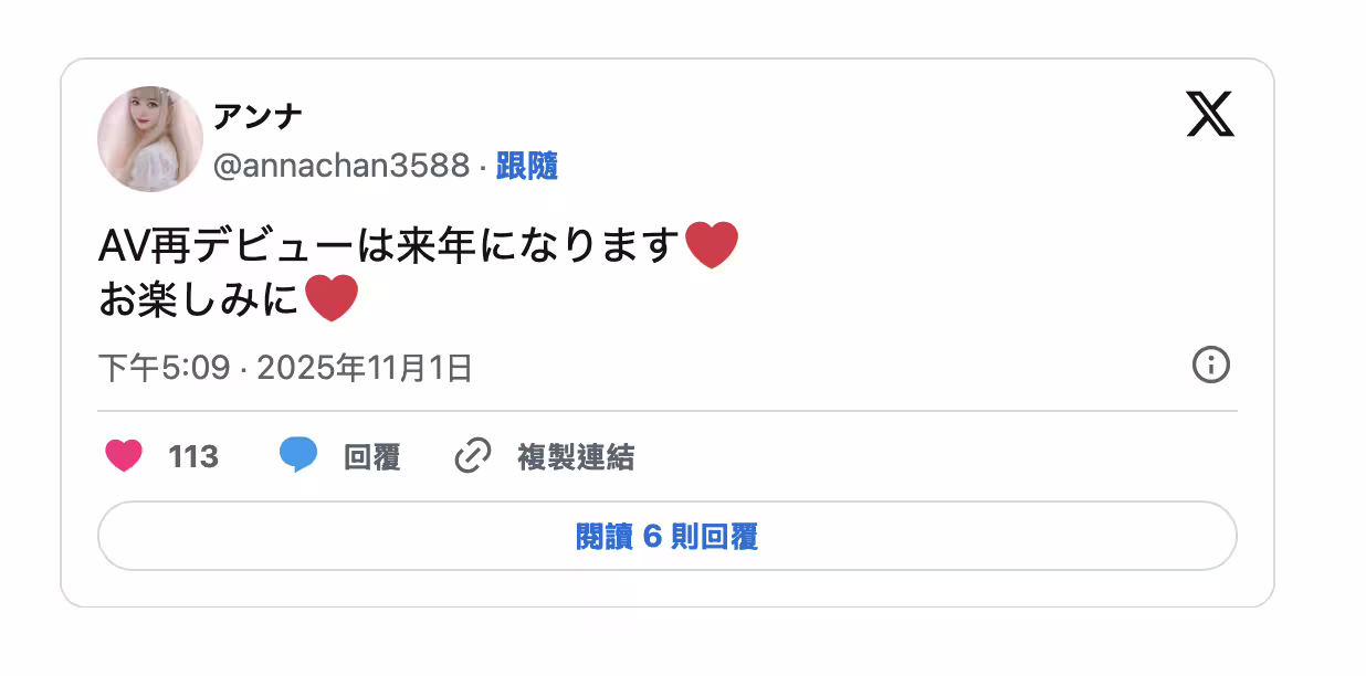 這也是2026年的什麼時候、在哪一家片商又要用什麼名字發片アンナ(Anna)通通沒有說明,所以我們也只能繼續等待;不過上次我也說了,和之前相比アンナ(Anna)的外型真的變得很不一樣,頭髮整個染成金的,五官輪廓也越來越像個外國人,這樣的她在出道一定有片商要但是能不能得到粉絲的支持很難說⋯