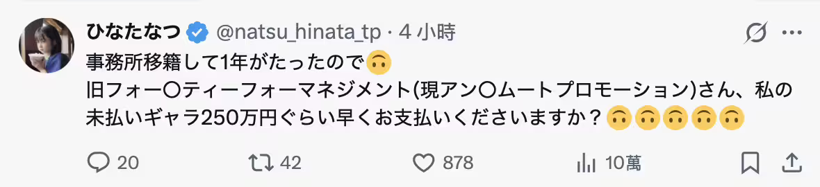 這也實在太扯了,我們都知道44 management可說是業界爭議最多的事務所,之前就讓深田えいみ(深田詠美)欠稅8000萬日幣,然後會長還出面受訪說一切都是女優自己的責任;後來又傳出薪水沒有入帳讓ひなたなつ(日向夏)天天在社群上抱怨最後變爆氣,想不到她都更換經紀公司一年了還是沒有拿到錢⋯