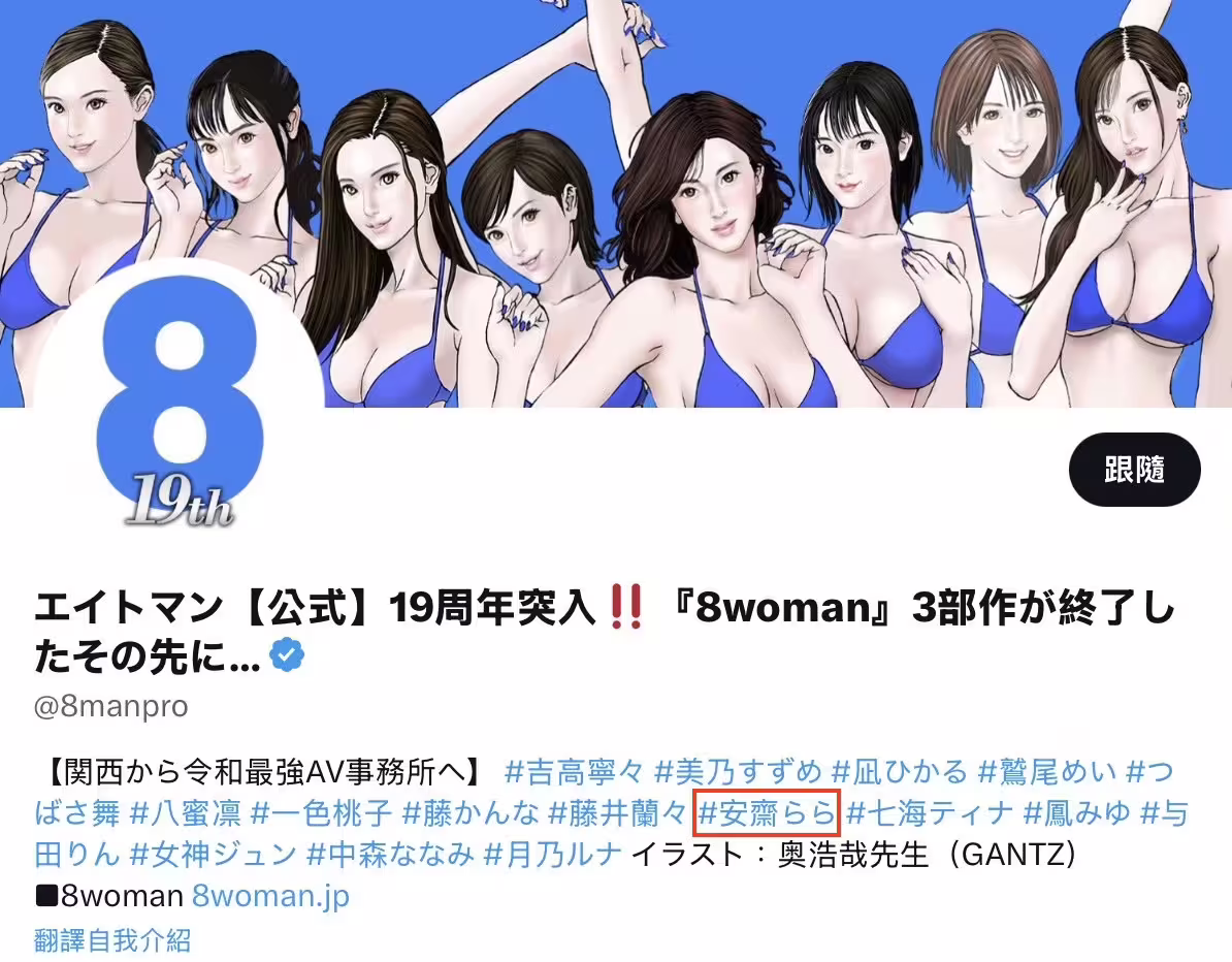 這應該會讓一些朋友好奇,這位元祖神乳現在到底什麼狀況?身為今年與經紀公司エイトマン(8MAN)合作的廠商,我應該可以回答這問題:首先,安齋らら(安齋拉拉)還是エイトマン(8MAN)的一員,這點從他們官方X(https://x.com/8manpro)自我介紹有標記她的名字可以得到證實;再來,安齋らら(安齋拉拉)並非只和特定廠商合作,只要你能接觸到事務所,提到讓他們心動也讓安齋點頭的企劃,就有機會合作〜