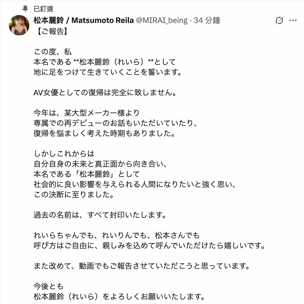 是要復出了嗎?沒有,不但沒有,明日見未来(明日見未來)還說自己要拋棄AV時代以來的藝名,從現在開始,她要以本名「松本麗鈴」展開活動〜