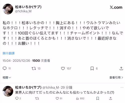 她是在X的小號提到,請大家不要修掉她胸口上方的痣,她說自己已經提醒大家100次了,那是她最有魅力的地方;還有脖子上那顆痣,也請不要自做主張把它修掉,因為她真的很喜歡那顆痣〜