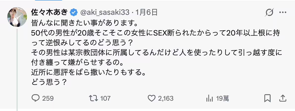 前天(1/6),這位不久前才復活的美麗熟女在社群(https://x.com/aki_sasaki33)公布了一段長久以來困擾自己的事,我直翻如下: