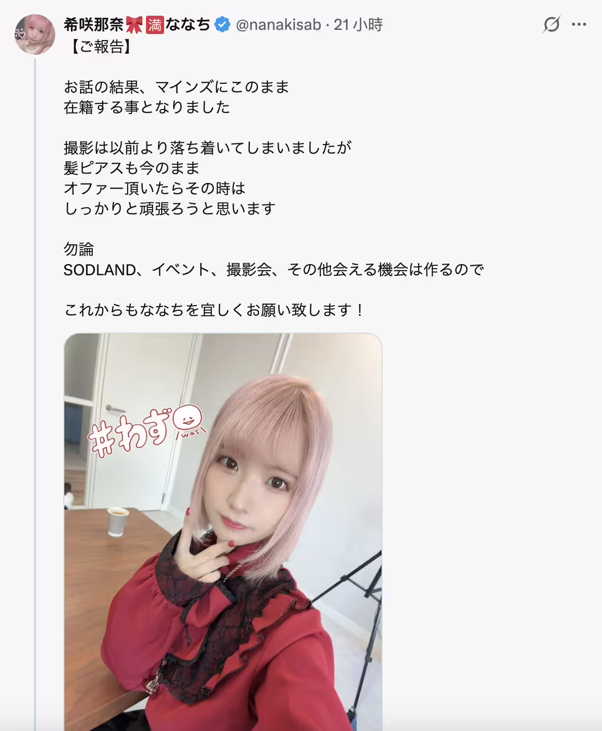再加上從13歲就開始困擾她的心理疾病以及非常在意被毀謗中傷的個性,希咲那奈很清楚這樣的她應該要非常認真地去思考是不是要引退了,所以她才會在今天和經紀人約了要好好談談,應該很快會有答案: