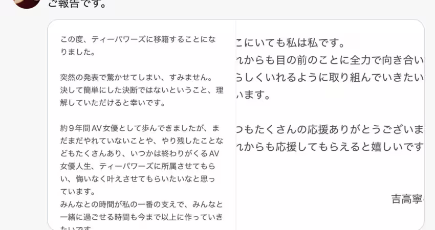 吉高寧々在X發表的聲明是這麼說的:這絕對不是一個輕率的決定,做為AV女優已經9年的時間了,還有很多沒有完成的心願,所以希望在新東家T-Powers的幫忙下全力以赴地朝目標前進〜