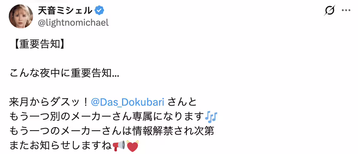 如果單純以ideapocket和ダスツ!(DAS)相比,天音ミシェル(天音蜜雪兒)當然是去了等級比較低的片商發片,不過阿根廷別為她哭泣,這位長身混血女優在自己的X(https://x.com/lightnomichael)告訴大家,雖然離開了ideapocket,不過現在的她可是兩家片商共有的專屬女優,一家自然就ダスツ!(DAS),另一家等情報解禁了再告訴你⋯