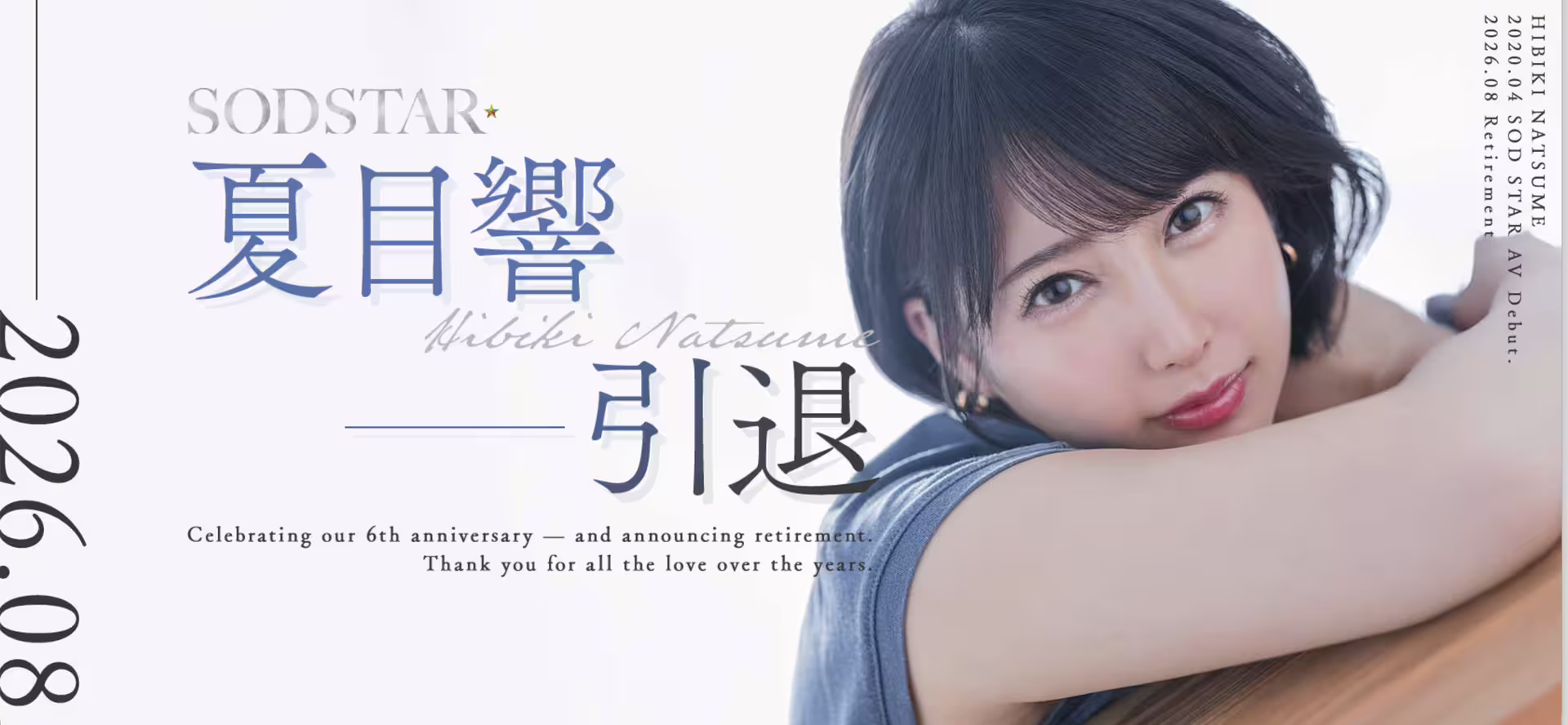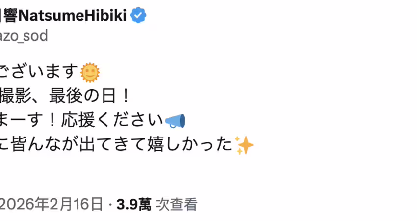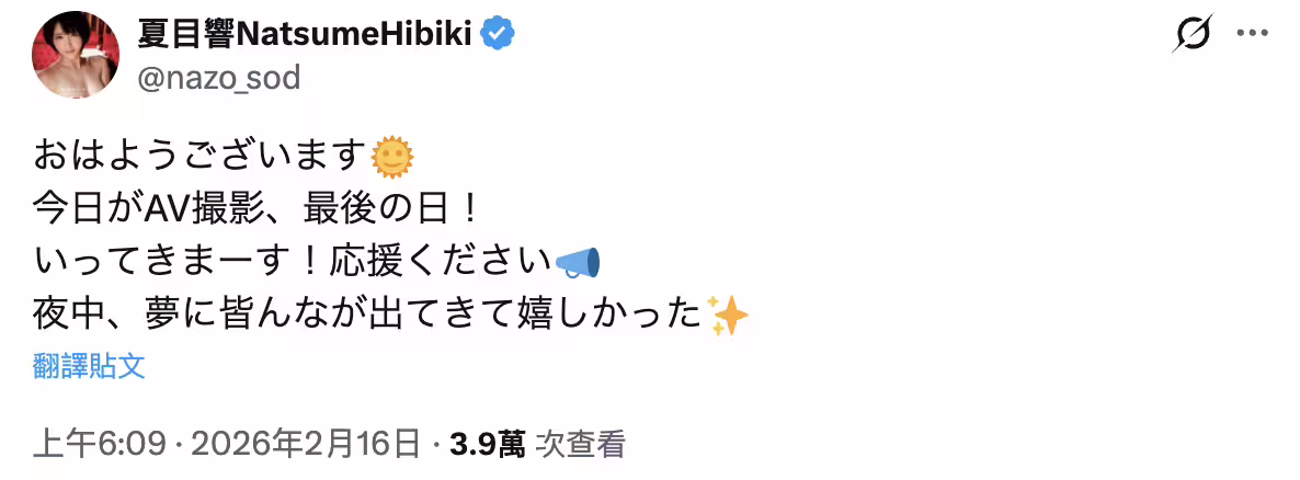 然後,她所屬的片商SOD STAR馬上跟上,除了在官網設下夏目響引退的專屬頁面,也宣布將會在8月發表最後的作品ー以這一行作品從簽約到拍攝再到剪輯後製然後發表上市需要半年做的時間來看,今天(2/16)去拍片是很正常的:
